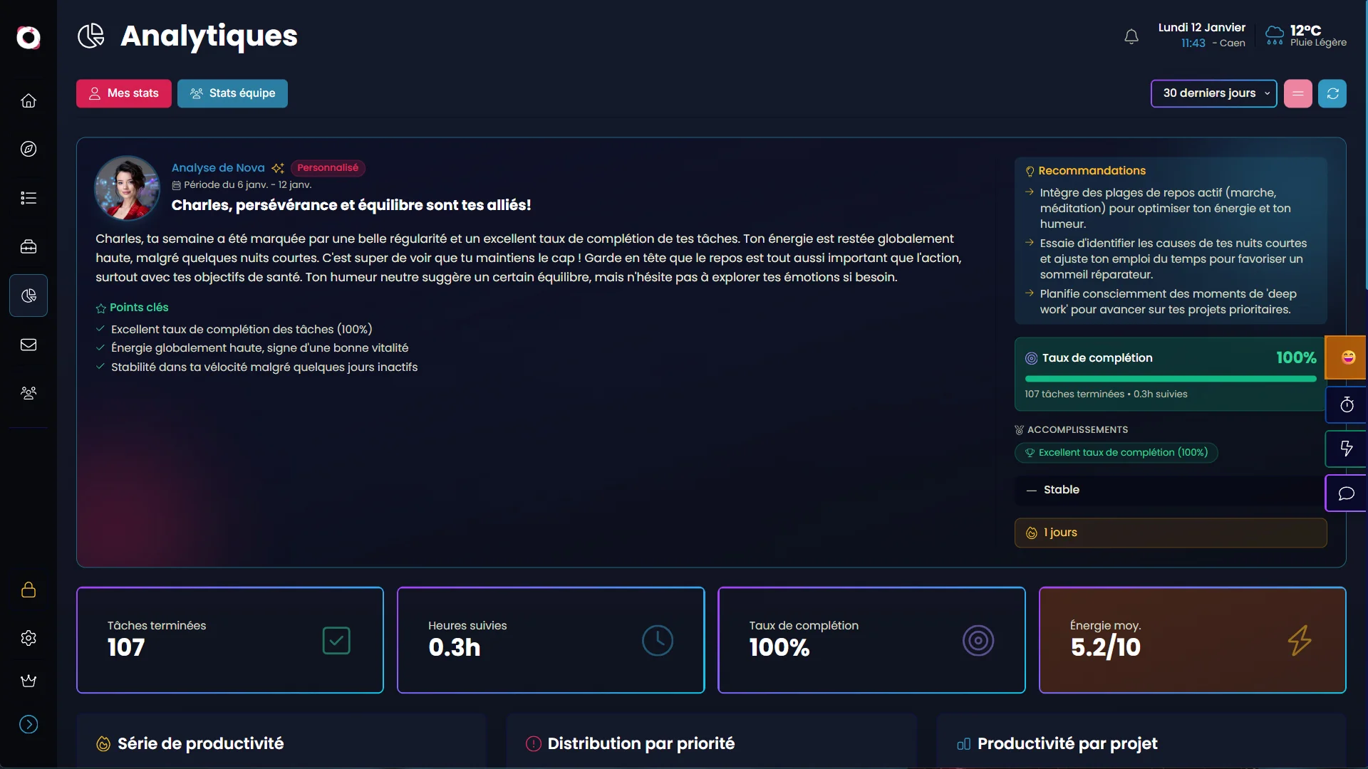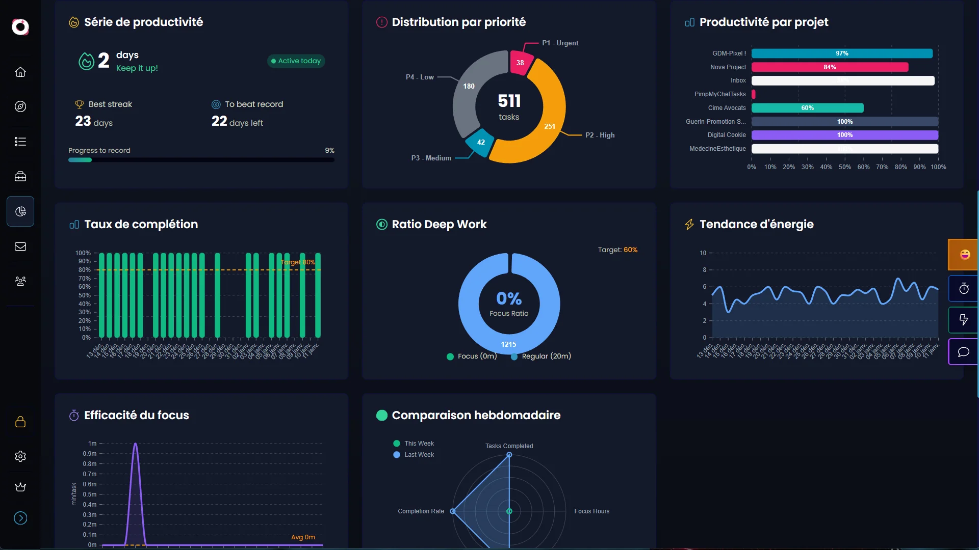 The Analytics dashboard gives you a clear view of your productivity with interactive charts: energy trend, task completion rate, focus session distribution, efficiency by time of day...