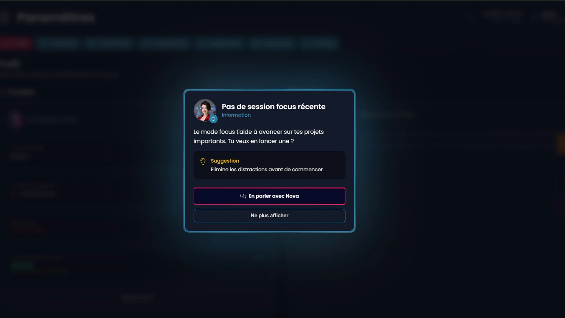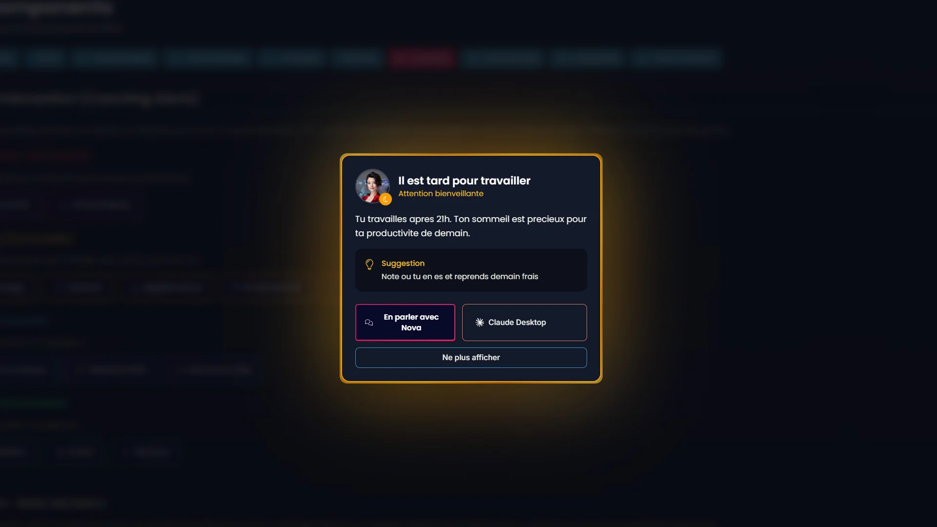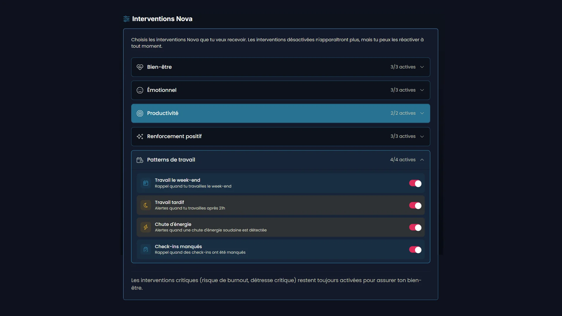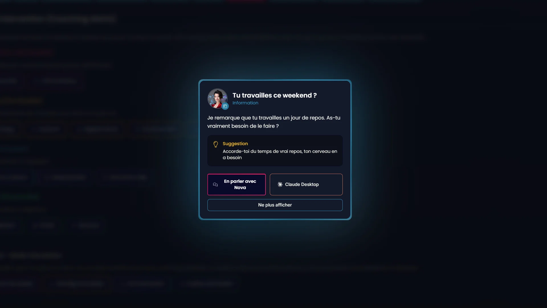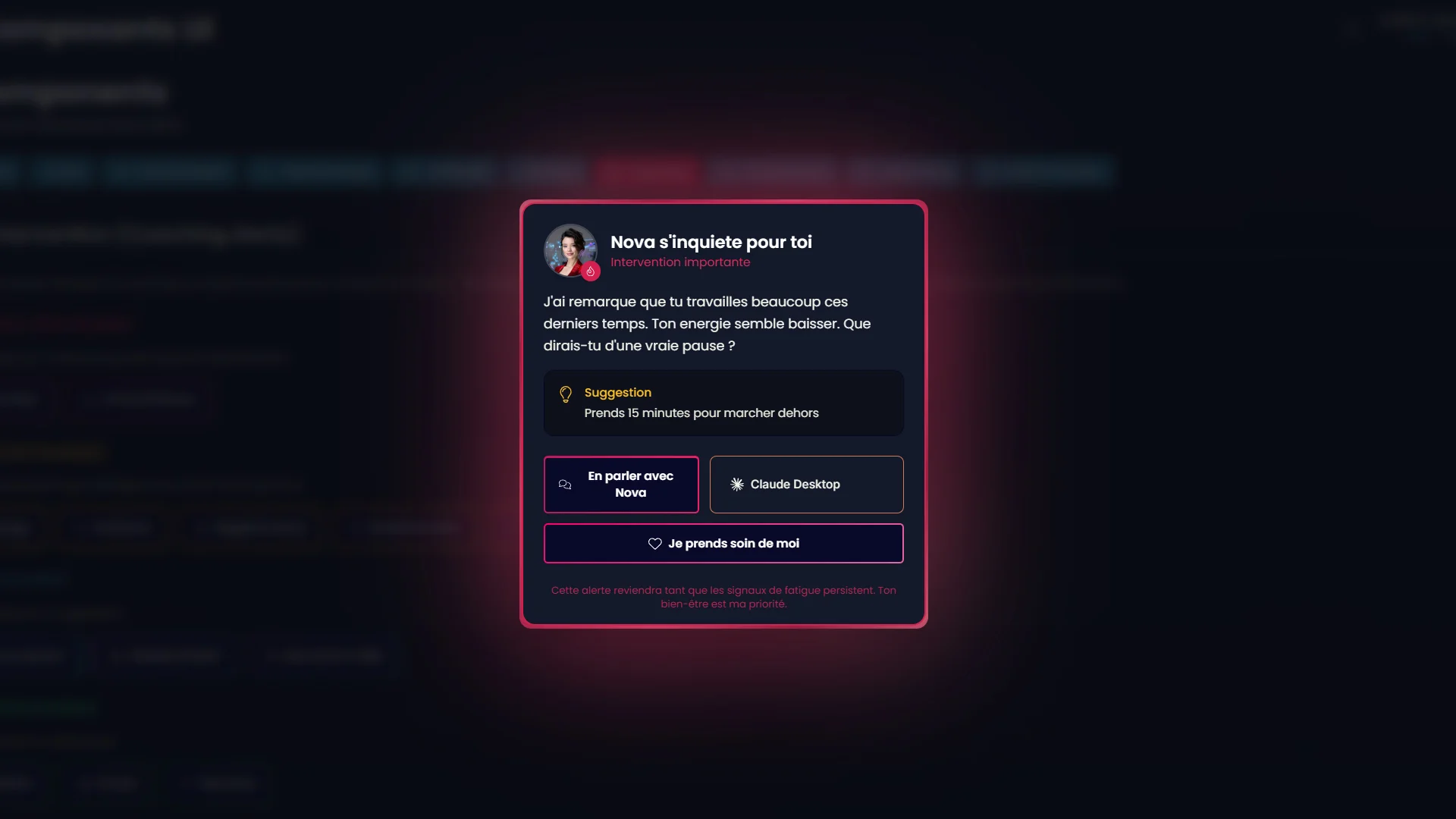 Nova analyzes this data over 7 days and automatically detects risky patterns: overwork, prolonged energy drops, late work or weekend work... When a warning signal appears, she triggers a personalized coaching intervention.