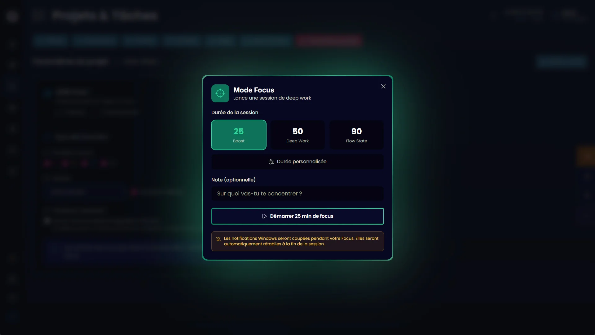 Combined with Focus sessions (Deep Work, Flow State), you have a complete view of your productivity.
