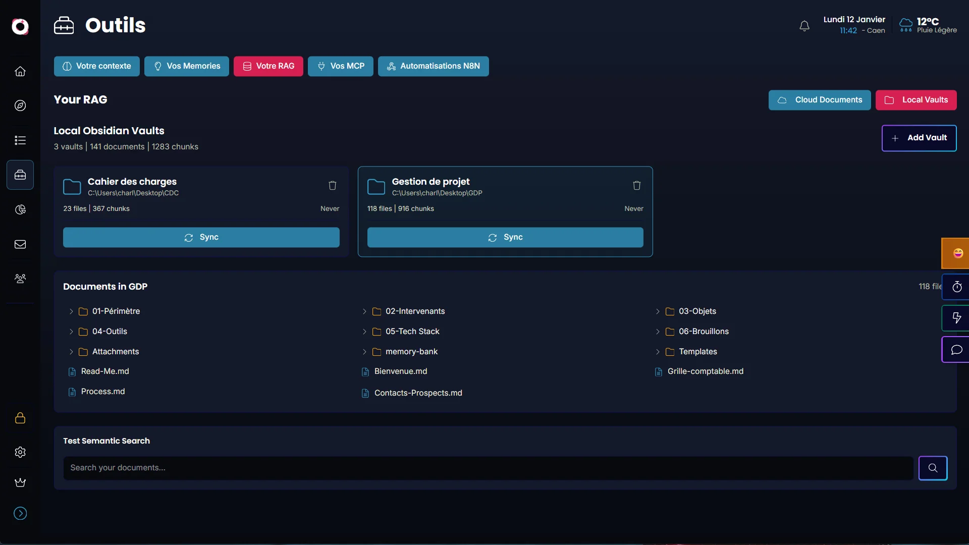 But Nova Mind goes further with the RAG system (Retrieval-Augmented Generation). Your documents can be indexed with AI embeddings, allowing Nova to search intelligently. Ask 'Find the contract with Dupont' or 'What did we plan for the Q2 budget?' - and the AI finds the answer in your files.