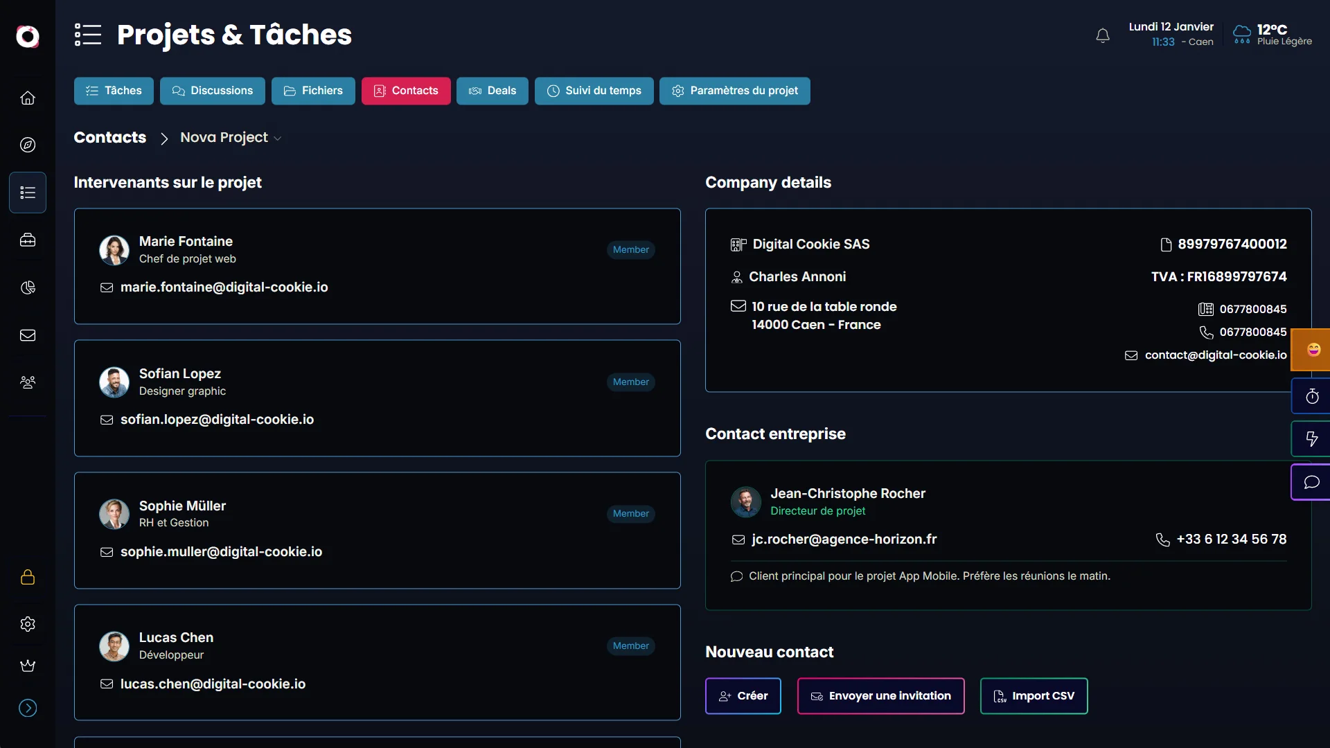 Contacts are linked to your projects: you immediately see who's involved in what. Nova Mind can send emails directly to your contacts, and you find all the exchange history.