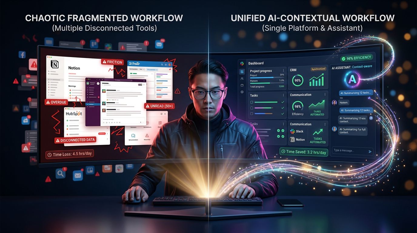 That’s exactly the problem a true integrated work tool solves. Not an aggregate of SaaS platforms linked by fragile integrations. A system where memory, tasks, CRM, analytics, and AI share the same context.